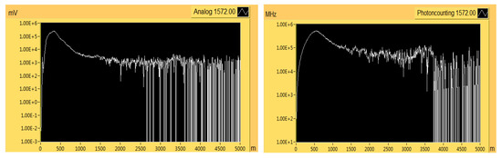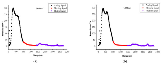 The measured lidar echo signals are spliced by the method in this paper to evaluate the splicing effect. The data used are the echo signals of online and offline wavelengths obtained in Wuhan, China, on 3 May 2016. Figure 6 is the original signal diagram of AD and PC, which can clearly show their advantages and disadvantages.