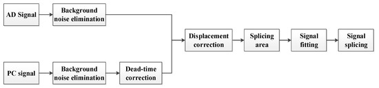 In addition to the dead time problem of PC, the problem of asynchronous signal reception between AD and PC signals in signal acquisition is observed. This problem is mainly caused by the different circuit timings of the two detection modes, which shows a displacement difference between AD and PC signals, and this displacement difference needs to be corrected before signal splicing.