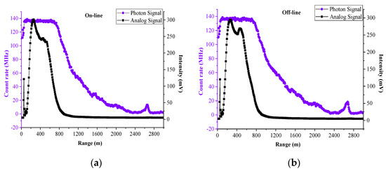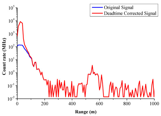 Dead time is a unique phenomenon produced in PC, which refers to the discrimination and response time required by the PC detector to receive signals. If the time interval between two photons received by the detector is very short, it will cause problems in the detector’s response to the previous photon and cannot effectively process and output. Therefore, the PC signal needs to be corrected for dead time. The dead time of the PC in our CO2-DIAL system is 7.5 ns. It is corrected according to Equation (5), and the final result is shown in Figure 7. In Figure 7, the blue line is the original PC signal, which shows that its saturation effect at a low altitude is evident, whereas the red line is the PC signal after the dead time correction: