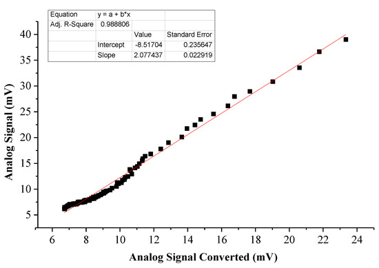 Figure 11 shows the linear relationship between the AD signal and the AD signal converted from the PC signal in the splicing area after piecewise fitting. Compared with Figure 8, linearity is improved, indicating that the proposed splicing algorithm is better than the traditional signal splicing algorithm.