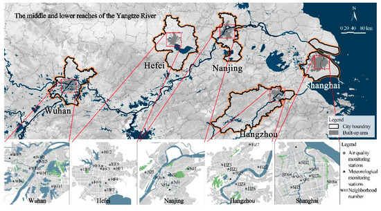 Five megacities (Wuhan, Hefei, Nanjing, Shanghai, and Hangzhou) in the middle and lower reaches of the Yangtze River were selected as the study area (Figure 1); they have the same climate conditions. Due to the extreme high-density construction, these cities experience more serious PM2.5 pollution than other cities in this region [31]. The similar features of the five cities provide sufficient comparability for this study, including urban form, landform, population, and PM2.5 pollution characteristics.