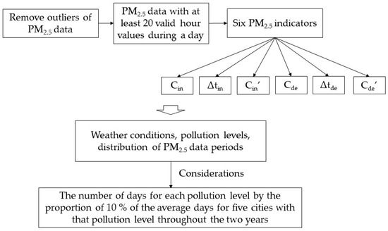 Our previous studies examined the influences of neighborhood green space and urban morphology on PM2.5 separately, providing evidence for the effects of urban green space coverage and morphological patterns and gray space forms on PM2.5 [18,32,35]. As a series of studies, hourly PM2.5 concentrations from 2016 to 2017 were collected from monitoring stations to ensure the consistency of PM2.5 data. These data in different cities were monitored with the same standard. Because of the different locations of 37 neighborhoods, the uncontrolled factors (such as weather conditions, PM2.5 background concentration of five cities) were kept at similar levels to remove the external impact factors as much as possible and to greatly minimize evident differences, thereby performing an intercomparison. Consistent with our previous studies [32,35], three relative indicators, the range (Cin and Cde), duration (Δtin and Δtde), and rate (Cin’ and Cde’), of the increase and decrease in PM2.5 concentration were calculated. To investigate pollution-level differences in the effect of the neighborhood-level built environment on PM2.5, four pollution levels, including slight (PM2.5 level ranging from 75 μg/m3 to 114 μg/m3), moderate (PM2.5 level ranging from 115 μg/m3 to 150 μg/m3), heavy (PM2.5 level greater than 150 μg/m3), and overall pollution, were analyzed based on Chinese ambient air quality standards. The average of slight, moderate, and heavy pollution levels of observations was defined as the overall pollution level. The process of PM2.5 data is shown in Figure 2. Consequently, PM2.5 data of eight, three, and two days in 2016, and eight, two, and one day in 2017 were used for slight, moderate, and heavy pollution, respectively (Table S2).
