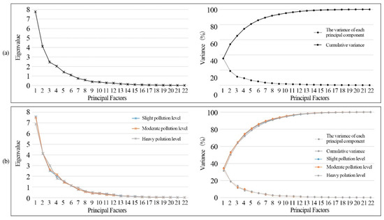 Variance and eigenvalue of principal factors at: (a) Overall pollution level; (b) Slight, moderate, and heavy pollution level.