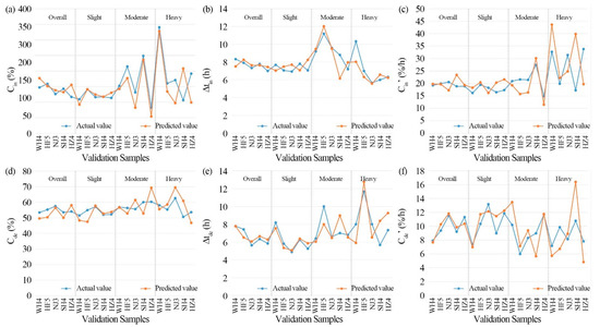 The prediction accuracy of the verification neighborhood samples was calculated for validation. Figure 4 shows the comparison between the predicted value and the actual value of PM2.5 indicators. Generally, the predicted value and actual value of each PM2.5 indicator were similar. There were individual samples with great differences between the predicted value and the actual value, which were mainly at heavy pollution, followed by moderate pollution. Furthermore, the accuracy of different PM2.5 indicators of five verification samples was compared through the RE value via Equation (3). At the overall pollution level, the RE of the six PM2.5 indicators of each verification sample was mostly less than 10%. The prediction error of different verification samples had great randomness. The maximum prediction error was Cin (33.3%) of sample HZ4, and the minimum was Δtde in WH4, whose RE was 0.3%. At different pollution levels, the trend of prediction error of verification samples increased with the increase in pollution level, and the prediction error of each verification sample varied greatly.