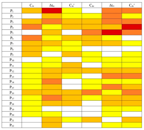 Because the included principal factors varied from model to model (Table 2 and Table S6), the most important factors influencing PM2.5 were obtained by counting the times of principal factors that significantly influenced PM2.5 in 24 models of four pollution levels. As Figure 5 shows, the darker the color, the greater the frequency of a principal factor. First, Cin, Δtin, and Cin’ were synthesized as the increase change of PM2.5. The decrease change of PM2.5 included Cde, Δtde, and Cde’. The principal factors that had the most significant impact on the increase change of PM2.5 were P1 and P3, which occurred seven times, followed by P4, P6, P16, and P17, which occurred six times. P7, P12, and P18 occurred five times. The most significant principal factor affecting the decrease change of PM2.5 was P5, which occurred 10 times, followed by P3 and P4, which occurred eight times. The frequency of P1, P12, P13, P15, and P16 was six times. Overall, P1, P3, P4, and P16 were important factors that significantly affected the growth and reduction of PM2.5 at the same time. These principal factors reflect the differences in green and gray space, building height and its differences, relative humidity, openness, and other characteristics of the neighborhood. In addition, these principal factors with high frequency were the factors that contributed the most to the corresponding dependent variable in the model. This further indicated their important role in PM2.5.