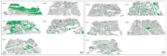 To strengthen the application of the regression model based on the built environment of the neighborhood and provide a reference for the optimization strategy of the built environment, we selected several neighborhoods from five cities with strong and weak PM2.5 reduction effects. A neighborhood with strong PM2.5 reduction effects is characterized by a high value of Cde and Cde’ or a low value of Δtde. Their effects on the increase and decrease of PM2.5 were analyzed through the analysis of the scale and spatial form of green and gray spaces in the neighborhood.