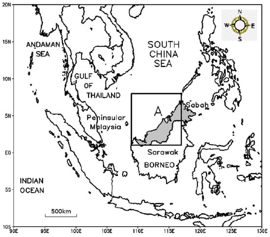 The study area is located at Borneo Island, the largest island in the Southeast Asia region (Figure 1), which is occupied by three nations i.e., Malaysia, Indonesia, and Brunei. However, in this study, the BSL events considered are limited to those bounded within the domain of 1.0–8.0° N, 109.0–117.0° E (Box A), and propagating towards the coastlines of Malaysian’s states of Sarawak and Sabah and Brunei (Figure 1).