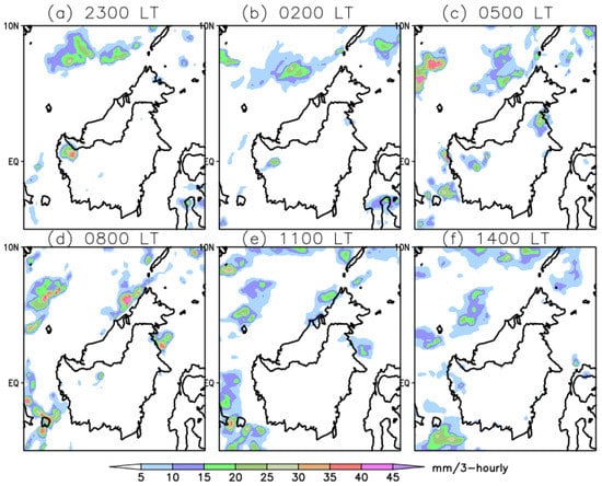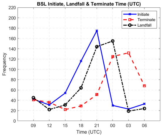 Figure 5 displays the averaged BSL initiation, termination and landfall times. The distribution suggests that the initiation, landfall and termination time is at 2100 UTC, 0000 UTC and 0300 UTC, respectively. As the frequencies are based on 3-hourly accumulated rainfall data, it is noted that BSL frequently initiated between 2000–2200 UTC, landfall between 2300–0100 UTC and terminated between 0200–0400 UTC. This indicates that BSL events mostly initiated during midnight/predawn and terminated in the morning, and therefore its formation and development mechanism are also likely to be influenced by the diurnal cycle. The diurnal cycle is one of the many controlling factors dictating the formation, propagation and dissipation of the SSL in the Straits of Malacca [11,12,14]. This condition was found to occur during the formation of the BSL as well. In the night-time, the land breezes from the Borneo landmass blow perpendicular to the coast. During this time, the land breezes are intense and much higher, while the sea breezes are weaker and shallower. Convective scale updrafts and outflows act to enhance the land breezes. The upward motion thus produced in the land breeze circulations coincidentally coupled with convective updrafts, creating much stronger and deeper vertical transport [14]. Besides, the coastline direction over the Borneo which is parallel to the low-level prevailing wind enhances the convective vertical development [15]. This may lead to more convergences between lower winds and the land breezes that are perpendicular to the coast and yield deeper shear. As BSL propagates eastward toward the coastline, it interacts with this shear to build deeper convection. Moreover, when reaching the land area, a weak shear is forced to occur due to the blocked convection by the land terrain of the island (poor lifting mechanisms) and thus, the BSL is ceased. The heat also suppresses the convection as the sun rises in the morning [14].