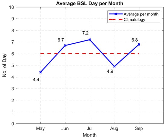 The result also reveals that the frequency of BSL shows a significant increase and decrease from July to September due to the movement of the trough slightly to the north during August as compared to its original position in July, then it moves again to the south close to the Borneo region during September. The higher frequency of BSL occurred with the position of the monsoon trough being closer to the equatorial SCS (10–20° N). On the other hand, a decrease in the frequency of BSL occurred when the position of the monsoon trough moves slightly to the north. This can be explained by [74] who described the monsoon trough as part of the Intertropical Convergence Zone (ITCZ), which is commonly described as a convergence zone between the wind patterns of the Southern Hemisphere and the Northern Hemisphere. Right along its axis, this wind convergence zone produces heavy rainfall that dominates the peak of the rainy season in certain locations. As it moves to the north/south or passes poleward of a location, hot and dry conditions develop. Due to this condition, the monsoon trough plays a major role in creating heavy rainfall episodes during the monsoonal season in the western Pacific, especially in the Asian region [74]. In addition, as the monsoon trough provides an environment of large vorticity, strong cyclonic vortexes, and tropical cyclones over the WNP often form in the vicinity of the monsoon trough [75]. It is also found that 70–80% of WNP tropical cyclones form within the monsoon trough in all months, except July and August, when the number of tropical cyclone formations outside the monsoon trough grows dramatically, mostly on its poleward side [76]. These conditions conducive to more troughs develop over the north of the equatorial SCS. Therefore, the movement of the trough to the north during August can be caused by the development of WNP TCs to be more to the north of SCS, thus presumably causing significant decreases of BSL. Accordingly, as the movement of monsoon trough plays a major role in influencing the rainfall distribution in Asia and Malaysia in general, therefore, this condition tends to affect the frequency of BSL events as well.