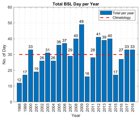 Figure 4 depicts the total annual frequency (day) of BSL from the year 1998 to 2018. The maximum and minimum occurrences were recorded in the years 2009 (49 days) and 1998 (12 days), respectively, with an average of ~30 days of occurrence per year. Interannual variation is clearly depicted with the number of occurrences in 2008, 2009, 2012, 2013, and 2014 are above average, while below-average years are in 1998, 1999, 2010, and 2015. These interannual variations appeared to be related to the ENSO. It is noted that the above-average occurrences are recorded after the La-Niña years, while those below-average are recorded after the El-Niño years. In addition, the increasing and decreasing numbers of occurrences are also related to the intensity of El-Niño and La-Niña. It is revealed that the above-average occurrences are evidenced after the moderate La-Niña, which is in 2007/2008 and 2010/2011. On the other hand, the below-average occurrences are evidenced after the strong and moderate El-Niño, which is in 1997/1998, 2014/2015 (strong) and 2009/2010 (moderate), respectively. Considering DJF period, the years of El-Niño and La-Niña from 1998 to 2012 are determined based on [67], while the remaining years are determined based on [68]. DJF describes the strongest ENSO period, therefore, it presumes to reflect the actual influence of ENSO in regulating the moisture transport in the atmosphere [58].