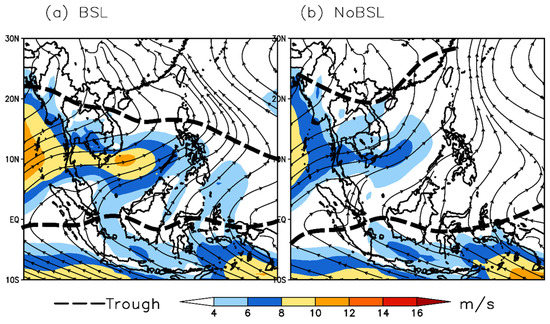 Composite 925-hPa daily wind streamline charts of all collected (a) BSL days; and (b) Non-BSL days from the year 1998 to 2018 (May–September). Blue to red shaded area indicates stronger wind speed, while monsoon trough is denoted by a black, thick-dashed line.
