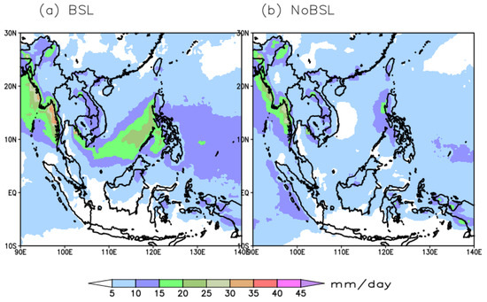 The seasonal composite of daily wind and rainfall during all BSL and non-BSL days from May to September are shown in Figure 6 and Figure 7, respectively. In Figure 6, the blue to red shaded area indicates stronger wind speed, while the monsoon trough is denoted by a black, thick-dashed line. During BSL (Figure 6a), the Northern Hemisphere monsoon trough is located closer to the equatorial SCS (10–20° N) compared to Non-BSL (Figure 6b). With the presence of the monsoon trough near the equatorial SCS, westerly winds from the Indian Ocean (IO) trap within this trough. At the same time, the monsoon trough in the southern hemisphere occurs between 0° to 5°S. This trough creates intrusion of the south-westerly winds into the SCS through Sumatra, Peninsular Malaysia, and Borneo Island terrain, thus enhancing the wind-terrain interactions on the west coast of Borneo [70]. This condition is known as the cross-equatorial flow. Furthermore, these cross-equatorial flows and the westerly winds give rise to a broad-scale belt of convergence in the equatorial SCS. The wind speed also plays an important role in the formation of BSL. It is noted that stronger westerly winds speed existed during BSL (Figure 6a) compared to non-BSL (Figure 6b). The impact of a broad-scale belt of wind convergence in the equatorial SCS is evident as intense rainfall concentrated over the SCS, northern region of the Borneo Island and eastern region of the Philippines during BSL (Figure 7a) compared to non-BSL (Figure 7b), a typical condition (dry weather) during the SWM season in Malaysia.