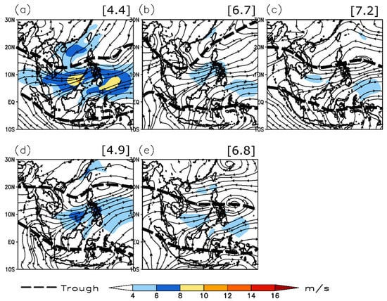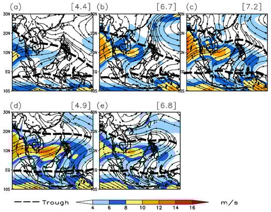 Composite of 925-hPa anomalous wind streamline charts of all collected BSL days during the presence of TCs in (a) May, (b) June, (c) July, (d) August, and (e) September from the year 1998 to 2018. The average frequency (day) of BSL per month is indicated in the bracket at the upper corner of each panel. Blue to red shaded area indicates stronger wind speed, while monsoon trough is denoted by a black, thick-dashed line.
