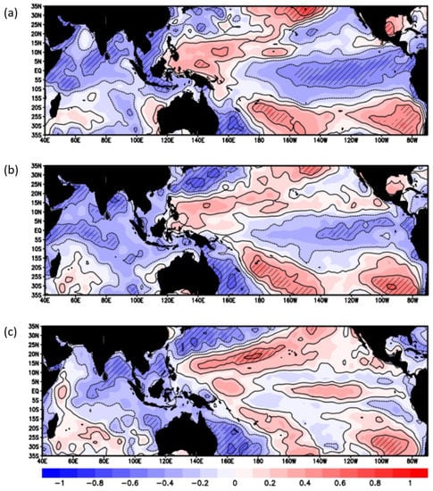 Correlation coefficient between BSL days and the SST anomalies (°C) during (a) January–March, (b) March–May, and (c) May–July. Areas significant at 0.05 level are hatched.