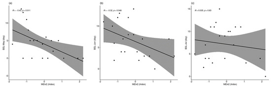Scatterplots represent the correlation between monthly frequency of BSL (day) and the DJF MEI (a) May, (b) June, (c) July, (d) August, and (e) September. The slope in black-line denotes direction of the relationship (positive/negative).