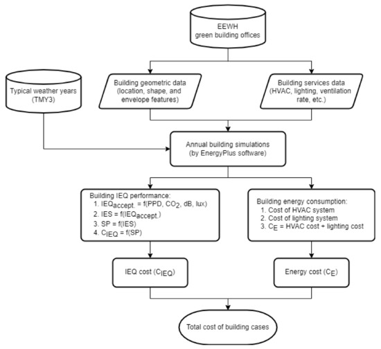 Through the simulation results of energy consumption from HVAC and lighting system and the IEQ performance in the investigated cases, this study analyzed the influences of energy-savings and IEQ categories in EEWH on energy expenses and IEQ costs, respectively. To emphasize the aforementioned influences, this study only considered the building costs related to IEQ expenditure, energy consumption of HVAC, and lighting systems. Figure 1 shows a flowchart that demonstrates the research agenda and analysis process of this study. The first step is to collate the information and metadata of the building envelope, HVAC system, and lighting system for each case. Secondly, the metadata is converted to the input format of the EnergyPlus software. EnergyPlus is a holistic modeling tool used to efficiently simulate the environmental and energy behavior of buildings and has been used in many sustainable building studies [59]. Then, hourly simulations of the building environment and energy consumption are executed with typical weather year data (TMY3) [60]. The third step is to estimate the energy cost (CE). According to EEWH, CE refers to the energy cost of the HVAC system and lighting equipment in the building, excluding other equipment. Meanwhile, the electricity-billing scheme of the Taiwan power company is imported into EnergyPlus for energy expenses estimation and CE calculation. The fourth step is the calculation of CIEQ. According to the simulation outcomes, the hourly indoor environmental conditions in each case can be acquired, including PPD, illumination, and CO2 concentration. Substituting these outcomes into Equations (6)–(10) obtains the IEQ variables of the thermal, lighting, acoustics, and IAQ aspects, as well as overall IEQ satisfaction. Lastly, this study can quantify the buildings’ economic costs and benefits derived from IEQ performance through Equations (3)–(5). In addition, there are some preconditions for the building simulations in this study. The acoustic environment, which cannot be simulated by EnergyPlus and is not feasible for performing long-term measurements, is assumed to be a constant level of ξ3 = 55 dBA (φ3 = 95%). The assumption is equivalent to a quiet office with some conversations and sounds of typing. Moreover, the lower and upper limits of SP according to Equation (4) are respectively 60.4% and 90.6%, so the maximum productivity in this study was set as SPmax = 90.6% [55]. The average value of the hourly salary refers to NT$260 announced by the Taiwan government. The occupancy density is 0.1 person/m2, and occupants work from 9:00 to 17:00 on weekdays. The daily expense of each building case is the sum of its CE and CIEQ in this study.