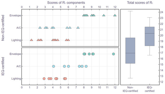 Scores of the total and three aspects of the energy conservation category. Green represents Envelope, blue represents A/C, orange represents Lighting. And the triangle represents non-IEQ-certified, the circular represents IEQ-certified.