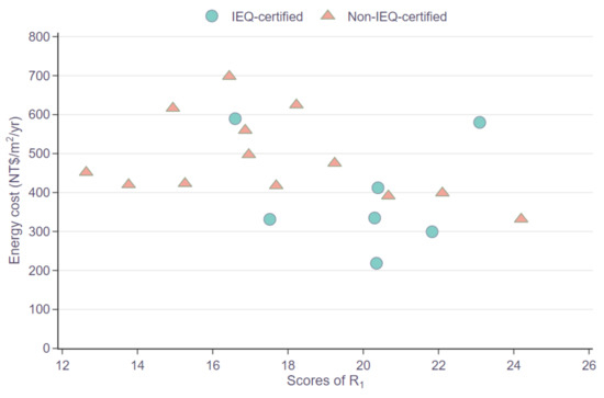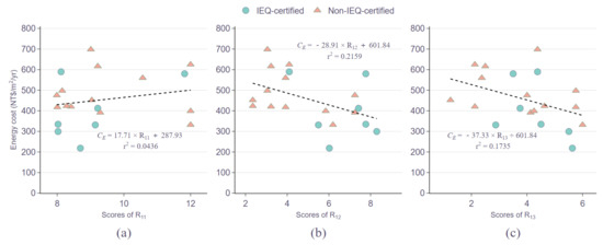 The relationships between energy costs and the aspects of R1 scores are shown in Figure 7. The R11 scores of IEQ-certified buildings (at average 9.0 score) and non-IEQ-certified buildings (at average 9.5 score) are both in the relatively high level of the R11 rating (score range 0–12). As shown in Figure 7a, the relationship between R11 scores and energy costs is not significant. The R12 scores of IEQ-certified buildings (at average 6.7 score) perform better than those of non-IEQ-certified buildings (at average 4.3 score), but the R12 scores of both groups are in the low level of the R12 rating (score range 0–14). In Figure 7b, the relationship between R12 scores and energy costs is negative, though the r2 value is only 0.2159. The R13 scores of the studied cases are distributed within the R13 rating (score range 0–6). The average score of IEQ-certified buildings is 4.3 and that of non-IEQ-certified buildings is 3.8. Referring to Figure 7c, the energy costs show negative relations with the scattered R13 scores. Although the r2 values between the energy costs and the R1 rating aspects are not significant, it still implies that a higher R12 or R13 score may help to reduce the energy costs. The results showing that it is difficult for GBC rating scores to reflect the energy performance match the findings in previous studies [22,61].