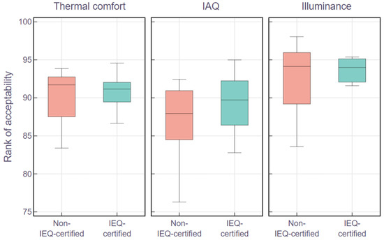 Regarding the thermal comfort aspect, IEQ-certified buildings have a 25th quantile, median, and 75th quantile of 89.5%, 90.6%, and 91.9%, whereas the values of the non-IEQ-certified group are 87.5%, 91.7%, and 92.7%. The median and 75th quantile of the non-IEQ-certified buildings are slightly higher than those of IEQ-certified buildings. Besides, the median score of IEQ-certified buildings is lower than non-IEQ-certified buildings by 1.1%.