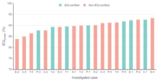 Moreover, Figure 5 shows the annual average IEQaccept of all cases. The IEQ-certified buildings are represented by a green bar, and the non-IEQ-certified buildings are represented by a red bar. Overall, there are 10 buildings with an IEQaccept score higher than 90%; four of these buildings are IEQ-certified and six of them are non-IEQ-certified. However, the average score of IEQ-certified buildings (90.5%) is only 1.2% higher than that of non-IEQ-certified buildings (89.3%).