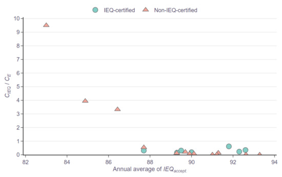 However, for buildings with a relatively poor performance (IEQaccept < 90%), especially the non-IEQ-certified cases, there is a higher possibility of obtaining an abnormal cost ratio, which is not supposed to occur in GBs. The results of this study correspond to previous research showing that the certified GBs have a wide range of building performances, but the worst ones may not be different from CBs [70]. Besides, all of the studies with similar results concluded that this phenomenon should be amended through GBCs amendment to make the scoring schemes of GBCs focus on the categories that actually improve occupants’ health, well-being, and productivity [35,37,40,43].