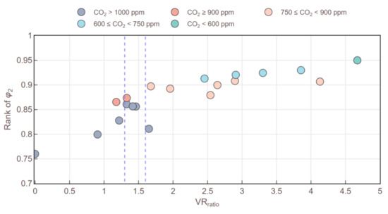 Secondly, the outdoor air ventilation rate plays an important role in maintaining sufficient IAQ and occupant satisfaction by introducing fresh air into buildings. Besides, the increasing cooling energy expense corresponding with a high ventilation rate is a consideration in hot-humid Taiwan. However, neither the related aspects for evaluating the ventilation rate nor the regulations for monitoring indicators of air pollutants, such as the CO2 concentration [64], are included in the EEWH certification system. Instead, there are only credit points in five ranks over the floor area proportion of ventilated spaces. The ventilation rate criteria in EEWH only provides suggestions for adopting real-time CO2 monitoring for energy efficiency that may reward credits in the energy-savings category; however, the criteria do not reflect the occupants’ satisfaction related to IAQ. The median of the IAQ acceptability in IEQ-certified buildings (at the value of 89.8) is higher than that of non-IEQ-certified buildings (at the value of 87.9) by 1.9% (Figure 4). Moreover, this study compared the ventilation rate of the studied cases to the minimum ventilation rate in ASHRAE 62.1 [65]. The comparison values werre calculated as VRratio by dividing the ventilation rates of the studied cases with the threshold of ASHRAE 62.1. Figure 8 displays the relationship between the IAQ acceptance (φ2), annual maximum CO2 level, and the values of VRratio. The scatters show that six of these cases fail to meet the Taiwanese standard of Indoor Air Quality Act (2011) [66], which is a provision for office spaces with all-time CO2 < 1000 ppm. According to the results, the buildings with VRratio lower than 1.6 may easily have a high CO2 concentration, and buildings with VRratio even lower than 1.3 tend to further decrease the IAQ acceptance. The results reveal the lack of prevention mechanisms and regulations in the EEWH system mentioned above.