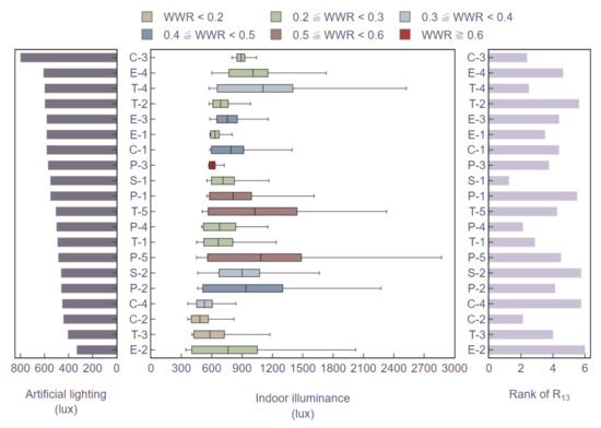 Furthermore, when observing the scores of R13 and artificial lighting designs, it was found that cases with similar R13 scores may not necessarily have consistent design values. For example, in the C-2, S-1, P-4, T-1, and T-4 cases, owing to the use of poor-efficiency lighting equipment, their R13 scores are all below 2.5 points though their artificial lighting designs vary from 440 to 600 lux. In contrast, T-2, S-2, and C-4 use LED lighting equipment with a better luminous efficiency, and their R13 scores are higher than 5.0. However, it was also discovered that E-2 deliberately reduces the artificial lighting design to have a high R13 score with the compromise of visual comfort. In addition, although the C-3 case uses LED lighting equipment, the excessive lighting design and energy inefficiency decrease the R13 score. To avoid similar situations, such as cases E-2 or C-3, this study suggests adjusting the benchmarks in the EEWH system against excessive or insufficient lighting.