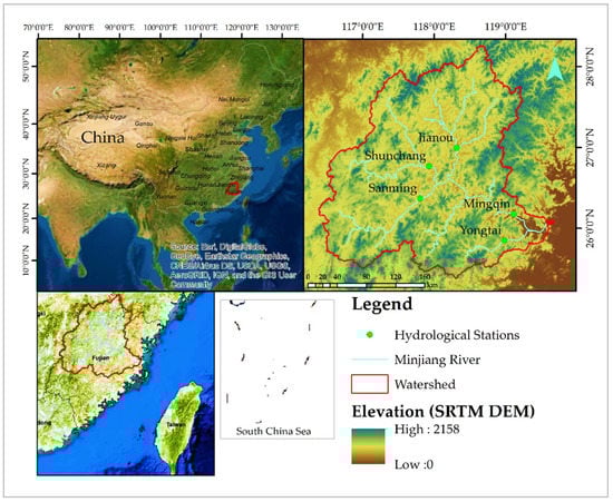 Location of the Minjiang river, its main tributaries, watershed, and hydrological stations.