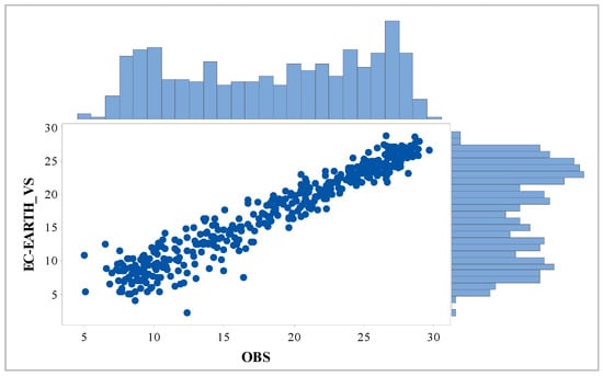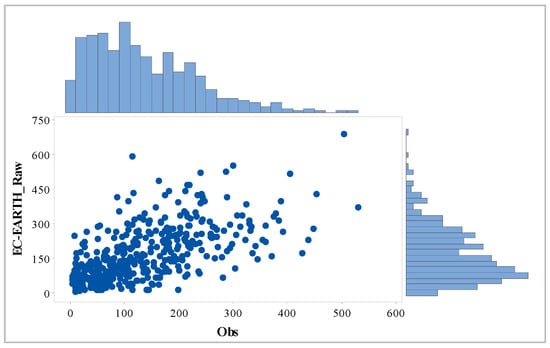Marginal plot between reference precipitation monthly time series (OBS) and raw EC-Earth data.