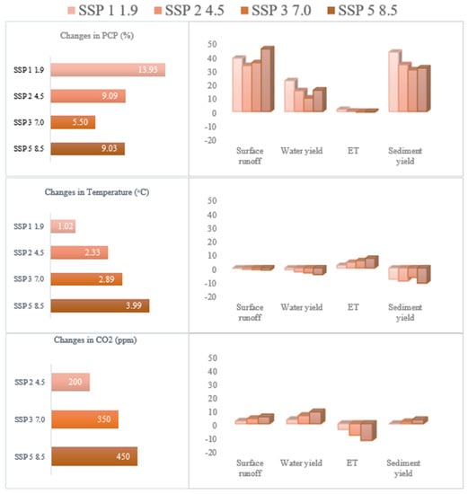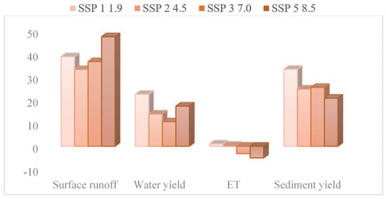 Surface runoff will be the most influenced hydrological parameter in the watershed. In the case of SSP 5, the annual surface runoff will increase by 48%, while in the case of the other SSPs it will increase by 33–40%. Sediment yield will be the second most influenced parameter. In the case of SSP 1, the annual sediment yield will increase by 33%, while in the case of the other SSPs, it will increase by 20–25%. The annual average water yield will increase by 23% in the case of SSP 1, while it will increase by 10–17% in the remaining SSPs. The ET will decrease by 5% and 3% in the case of SSP 5 and 3, respectively, while it will slightly increase in SSP 1 and 2 (Figure 6).
