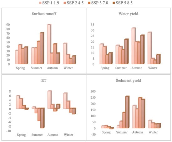 Seasonally, spring surface runoff will increase by 30–42% with little difference among SSPs. In summer, it will increase by 70% in the case of SSP 5, while in the other SSPs, it will increase by 40–50%. In autumn and winter, surface runoff will increase more, by 88% and 46%, respectively, in the case of SSP 1. Water yield will follow the pattern of surface runoff, i.e., in summer, it will increase more in the case of SSP 5, while in autumn and winter, it will increase more in the case of SSP 1. ET will increase in all the seasons in the case of SSP 1, while in the case of SSP 5, it will increase only in autumn. In the other SSPs, ET will experience comparatively smaller impacts across the seasons. In summer and autumn, sediment yield will increase more in the case of SSP 5 and 3, while in winter and spring, it will increase more in SSP 1 and 2 (Figure 7).