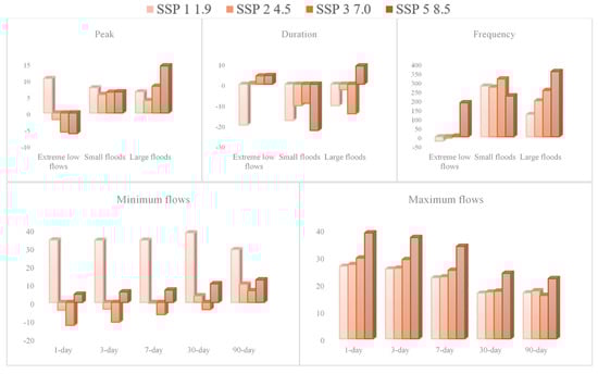 The peaks of extreme low flows (<500 m3/s) will increase in the case of SSP 1, while it will decrease in other SSPs, with the largest decrease in SSP 5. The peaks of small floods (>10,000 m3/s) will increase across the SSPs with little difference, while the peaks of large floods (>14,000 m3/s) will increase largely in SSP 5 followed by 3 and 1. The duration of extreme low flows will decrease in case of SSP 1, while it will slightly increase in SSP 3 and 5. The duration of small floods will decrease across the SSPs, with the largest decrease in SSP 5 and 1. The duration of large floods will increase in the case of SSP 5, while it will decrease in the other SSPs. The frequency of extreme low flows will slightly decrease in the case of SSP 1, while it will increase in SSP 5. The frequency of small floods will increase across the SSPs with little difference. The frequency of large floods will increase across the SSPs with the largest increase in the case of SSP 5 followed by 3, 2, and 1. The minimum flows will increase largely in the case of SSP 1, while the maximum flows will increase across the SSPs with a greater increase in the case of SSP 5 (Figure 8).