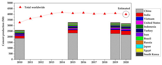 Annual cement production (data taken from [,]; [] is based on IEA data from IEA (2020) Global cement production, 2010–2019, www.iea.org/data-and-statistics, accessed on 2 November 2021. All rights reserved; as modified by J. Kim, IAE).
