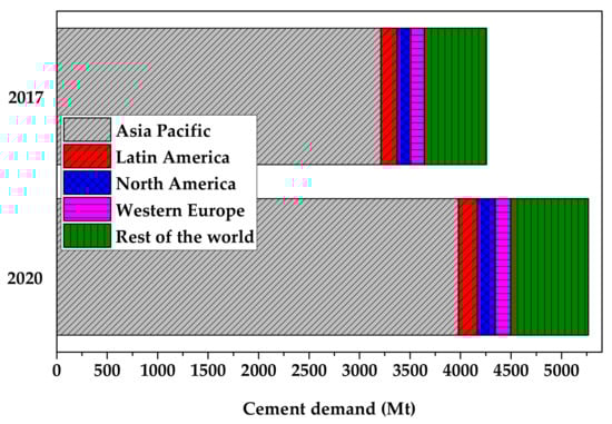 - Demand for Cement Worldwide in 2017 and 2020, by Region, Statista. Available online: https://www.statista.com/statistics/248340/global-cement-demand-by-region/ (accessed on 25 August 2021).