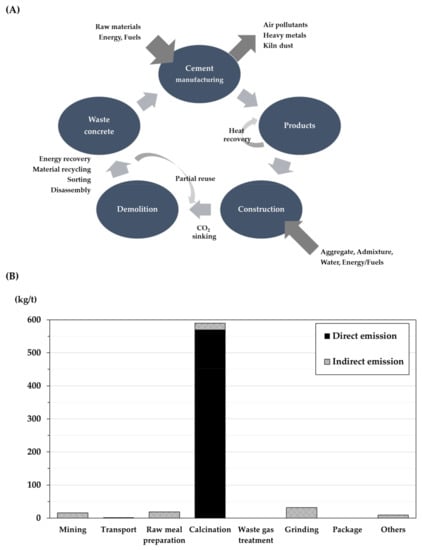 Life cycle (A) and greenhouse gas emissions by process (B) of cement production (data taken from []).