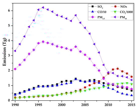 Air pollution emissions trend from China’s cement industry for the period 1990–2015 (data taken from []).