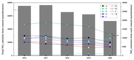 NOx emissions of Korean cement manufacturers for the period 2016–2020 (Units: tons/year) (data taken from []).