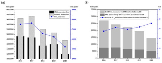 (A) NOx emissions according to clinker and cement production in South Korea; (B) Ratios of NOx emission from Korean cement manufacturers (Units: ton/year, %) (data taken from [,]).