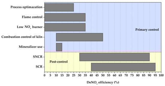 Methods for reducing NOx generated in the cement production process (Figure 8) can be largely divided into primary control (combustion step) and post-control (after combustion) processes. Based on the combustion stage, primary control is a method of minimizing NOx generation by changing the combustion conditions, and the post-control method is a method of removal of NOx generated through a chemical reaction. The primary control to change the combustion conditions suppresses N2 oxidation by lowering the oxygen concentration and flame temperature in cement; however, if high-temperature combustion conditions are used, the reducing atmosphere is optimized. The presence of substances such as C, CO, HCN, CH* (hydrocarbon intermediate), NH3, and (NH2)2CO enables NOx removal. However, in the case of primary NOx treatment (Figure 9A), another air pollutant, CO or CO2, is generated; therefore, this method is undesirable. In addition, although the primary control method optimizes the process to change the conditions of the existing process, burner change, and combustion condition control, there is a limit to NOx generation; thus, it has a maximum reduction efficiency of 60%. To efficiently remove the generated NOx, a separate reducing agent (NH3, (NH2)2CO) is supplied to perform the post-NOx treatment (Figure 9B). In this process, NOx reduction of up to 95% can be achieved by using a reducing agent (NH3 or urea) in the SNCR or SCR process [,,,,,,].