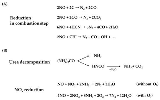 NOx reduction pathway ((A) primary control, (B) post-control) with reducing agents.