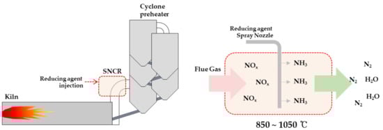In the NOx reduction process established in cement factories, a low NOx burner is used as the primary control method for a single process, and SNCR, a method for reducing NOx by supplying a reducing agent at high temperature, is most commonly used in the post-control method. Therefore, for more efficient reduction, a complex process that can reduce more NOx by the post-control method after reducing some NOx through the primary control method is sometimes applied [].