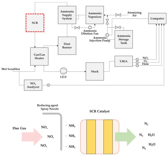 The SCR process using a catalyst is the most efficient process for reducing NOx and is widely applied in industries (combustion or production process, transportation, etc.) corresponding to the NOx emission source. The catalyst used is based on the already commercialized composition (V2O5-WO3(or MoO3)/TiO2), and depending on the process conditions (temperature, space velocity, etc.) to which SCR is applied, honeycomb, plate, and corrugated types are selectively used. As NOx is reduced through a catalytic reaction at an appropriate reaction temperature (300–400 °C), NOx removal efficiencies of up to 90% or more are achieved []. This SCR process can remove NOx more efficiently by applying different catalyst types depending on the exhaust gas and overall process conditions. Accordingly, SCR is applied to thermal power plants or mobile pollution sources (ships, automobiles), which are sources of NOx in Korea, to remove NOx; however, the SCR process has not been applied in cement factories. Therefore, to prepare for the stringent NOx regulations and emission charges, recent attempts to introduce them into the Korean cement industry have been made.