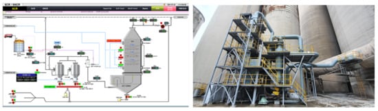 In the case of Germany’s Solnhofen (Figure 12), which introduced SCR for the first time, the SCR facility with the highest reduction efficiency in the cement process was installed on the right side of the preheater for a pilot test. It consisted of three honeycomb catalyst layers and an empty layer between the catalyst layers. In the case of a honeycomb catalyst, compressed air is used to wash the dust accumulated, in the cement process, on the catalyst to increase the pitch size and minimize the clogging of the catalyst, and an SCR system suitable for the cement process is utilized [].
