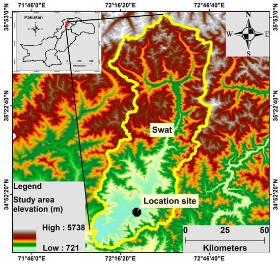 Mingora is the capital city of the Swat district and is located in the north of Pakistan (34.77° N, 72.36° E) with an altitude of 984 m above sea level (masl), as shown in Figure 1. The population of Mingora city is over 331 thousand. It is the largest city in the northern part of Khyber Pakhtunkhwa (Pakistan) and the epicenter of the surrounding areas. Located on the northern side of the Mingora city is the Swat River, which is approximately 240 km in length. The eastern and southern parts of the city are surrounded by mountains. These mountains are the part of the famous Hindu Kush range. The minerals in rocks found in the mountains of Swat are kaolinite, clinochlore, calcian albite, epidote, calcite, quartz, paragonite, halloysite and montmorillonite [32]. Being the major city, it has many restaurants, hotels and hospitals (public and private) and better health facilities. Moreover, this city is also the center for different crafts such as woodwork, the mining of gemstone, marbles, and many small-scale industries such as plastic, steel, marble and cosmetics. The climate of the city is moderate, generally warm and humid subtropical. June and January are the hottest and coldest months of the year with mean a temperature of 29.2 °C and 7.6 °C, respectively. There is plenty of precipitation in this site; the recorded annual mean precipitation is 897 mm. Sampling was carried out in the Higher Secondary School building. The building is located on roadside 15 feet above the ground.