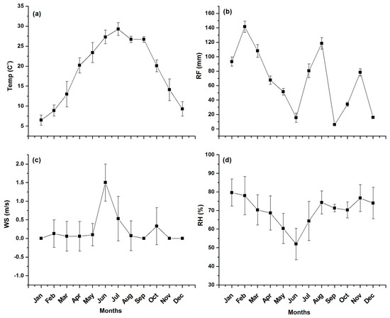 The monthly variation in metrological conditions of Mingora city is depicted in Figure 2. The temperature ranged from 6.5 °C (January) to 29.3 °C (July) with an average value of 17.9 °C. The minimum value of Relative Humidity (RH) varied from a minimum value of 52% during the month of June to a maximum value of 79.67% during the month of January with an average of 65.83%. The maximum Rain Fall (RF) was found to be 141.5 mm during the month of February while the minimum RF was found to be 6 mm in the month of September with an average of 73.75 mm during the study period. The wind speed in the months of January, September, November and December was found to be zero, whereas the maximum wind speed (1.5 m/s) was recorded in the month of June with an average of 0.23 m/s. The wind direction/wind speed figure is added as Figure S1 in the Supplementary Material. The prevailing winds were almost calm during the study period. However, some of the winds at the site arrived from the south, north-west, south-west and south-east directions (see Figure S1).