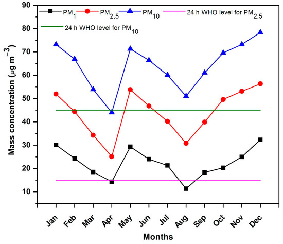 Monthly variation in PM mass concentrations during 2019.