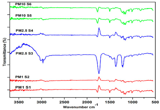 FTIR spectra of PM1 (S1, S2), PM2.5 (S3, S4) and PM10 (S5, S6) ranged from 500 to 3700 cm–1.