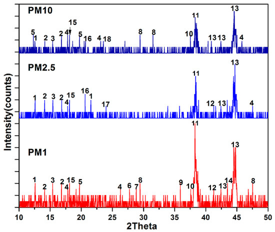 XRD pattern of PM1, PM2.5 and PM10. The numbers: 1, wollastonite; 2, ammonium sulphate; 3, wustite; 4, illite; 5, kaolinite; 6, augite; 7, crocidolite; 8, calcite; 9, calcium aluminum silicate; 10, hematite; 11, copper sulphate; 12, dolomite; 13, quartz; 14, vaterite; 15, calcium iron oxide; 16, muscovite; 17, gypsum; 18, vermiculite.