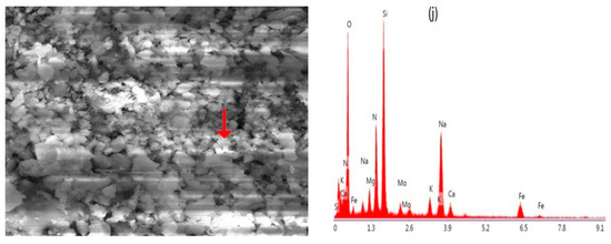 The detection of elements like Al, Ca, C, Fe, Mg, O, K, Si, and Na confirmed the presence of aluminosilicate and quartz. The comparison of the current analysis to previously published research indicates that geogenic particles are generated by the re-suspension of soil/road dust and other anthropogenic particles from fossil fuels and biomass combustion [62,86,87,88]. Aluminosilicates make up to 72% of all chemical compounds found in the Earth’s crust [68]. Our findings indicate that particles of aluminosilicates extracted from the soil are primarily made up of oxides of Al and Si, with varying quantities of K, Na, Ca, Mg and Fe. The size of aluminosilicate particles ranged from 2.3 μm to 30 μm. The particles analyzed in this category are shown in Figure 6d. These particles had a sharp edge-like morphology and were identified as Na-feldspar (albite), in the same way other particles were identified, such as Ca-Mg aluminum silicate, Figure 5e; K-feldspar (K aluminum silicate), Figure 5f; Mg-iron aluminosilicate, not shown in figure. This aluminosilicate category accounts for approximately 19% of the total particles examined, suggesting that minerogenic particles are abundant, as shown in Figure 7. Other researchers have also found similar findings about aluminosilicate [40,62,89].