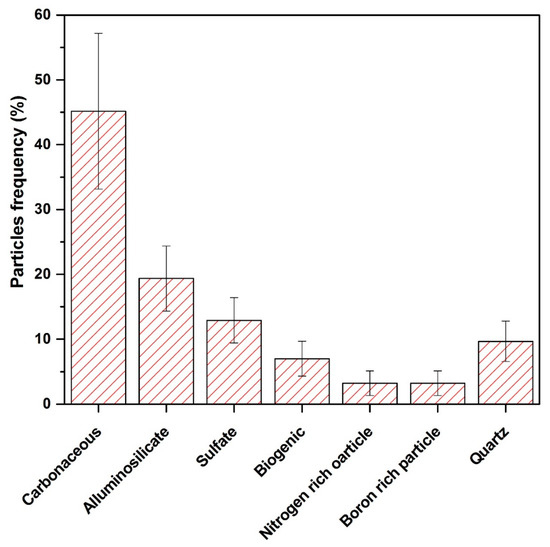 Quartz (SiO2) particles (also known as silica) have a high silicon (Si) and oxygen (O) content. These particles are characterized by having almost 50% Si + O by weight. In our environment, pure silica particles are found naturally as well as anthropogenically [46,62,76]. It is the most common chemical constituent of the Earth’s crust. The key component of sandstone and granite is silica. Hence, soil is the most common source of silica particles. Furthermore, silica is widely used in the manufacturing of building materials such as cement, glass, bricks, clays and ceramics. As a result, these particles are likely to have come from the construction and demolition of buildings [46]. These particles represent 10% of the total particles analyzed, as shown in Figure 7. The size range of silica is from 0.23 to 0.45 μm. In this group, particles of grossular, biotite and almandine were identified, as shown in Figure 6g–i. Similar kinds of particles have been identified by previous analysis [40,46].